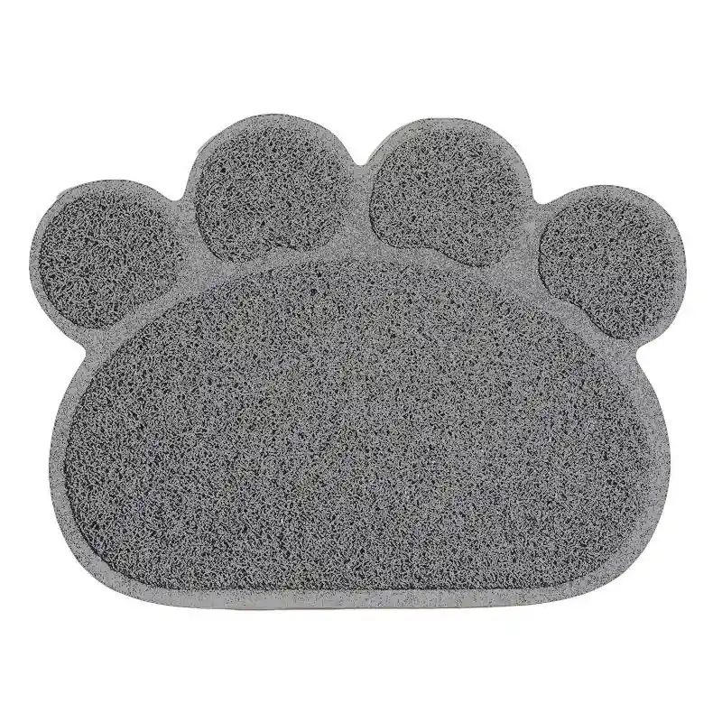 . Evita que la comida y el agua se derramen en el suelo mientras tu mascota está comiendo. . Ideal como sistema de respaldo antideslizante que coloca la caja de arena asegurará estabilidad. . Absorbe la suciedad, la comida y la arena de la pata de tu mascota. . Diseño compacto y hermoso diseño y colores. . Fácil de limpiar y de usar. . Material: PVC. . Color: Gris . Diseño: Huella. . Dimensiones: 55 x 45 cm aprox. . Contenido: 1 Alfombra Antideslizante.