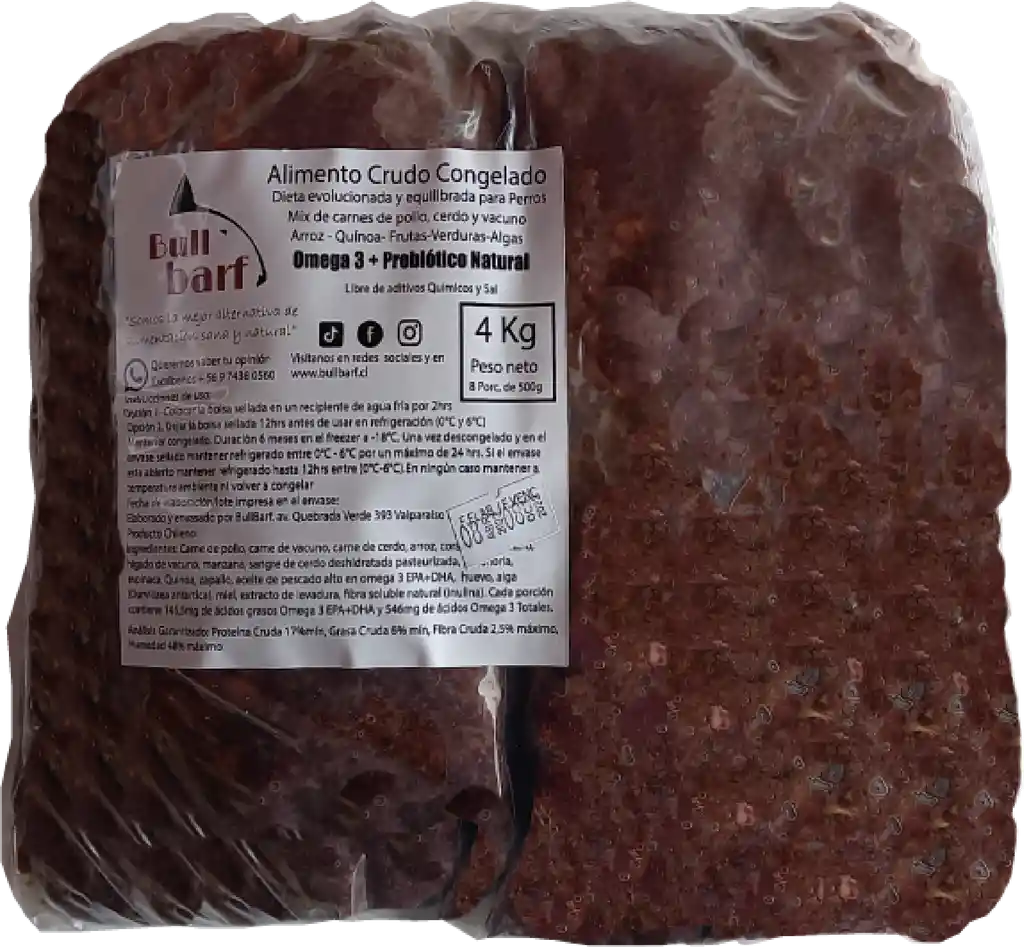 Alimento crudo congelado de fórmula equilibrada para perros de todas las razas y tamaños. Elaborado con un mix de carnes frescas, más ingredientes naturales esenciales de alto valor nutricional. Cada unidad contiene 8 porciones de 500g sellados al vacío. Composición. 65% de mix de carnes frescas de pollo (músculo, hueso carnoso), vacuno (músculo e hígado) y cerdo (músculo, corazón), arroz, quínoa, fruta fresca (manzana verde), verduras frescas (zanahoria, zapallo, espinaca), alga (Durvillaea antarctica), huevo pasteurizado, miel orgánica, extracto de levadura, extracto de la raíz de achicoria como fibra soluble natural y aceite de pescado alto en Omega-3 (EPA+DHA). Cada 100g de alimento contiene 145,5mg de ácidos grasos omega 3 EPA+DHA 546mg ácidos omega 3 totales