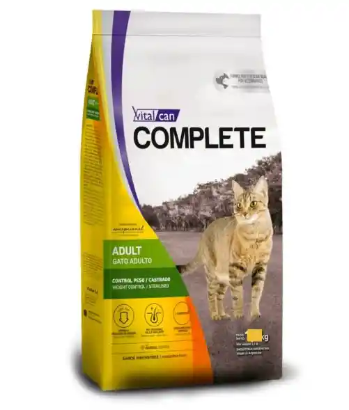 Vitalcan Complete para gatos adultos de 12 meses a 7 años con tendencia al sobrepes Low In Fat Formula / Fórmula reducida en grasas: Posee un 20% menos de grasas respecto a la fórmula Complete Gato Adulto. Healthy Skin – Shiny Coat / Piel Saludable – Pelaje brillante: El aceite de pollo, fuente de omega 6, brinda humectación a la piel y brillo al pelaje. Reduce Body Fat: L- Cartine Plus / Reducción Grasa Corporal: L-Carnitina Plus: Con L- carnitina, ingrediente que permite transportar las grasas para convertirlas en energía, generando así un descenso más rápido y saludable de peso. Con Hairball Control Ingredientes Arroz, harina de vísceras de pollo, harina de carne, maíz, gluten de maíz, harina de soja micronizada, harina de germen de maíz, aceite de pollo, grasa bovina, pulpa de remolacha, hidrolizado de vísceras de pollo, aceite de pescado, levadura de cerveza, trigo, manano-oligosacáridos (MOS), fructooligosacáridos (FOS), taurina, lisina, metionina, sal, zeolita, extracto de Yucca schidigera, celulosa en polvo, cloruro de potasio, bisulfato de sodio, L-carnitina, sorbato de potasio, BHA, BHT, lecitina, tocoferoles, extracto de romero. Vitaminas: A, D3, E, colina, C, ácido nicotínico, biotina, ácido pantoténico, B1, B2, B6, K3, ácido fólico, B12. Minerales: zinc, hierro, cobre, manganeso, yodo y selenio.