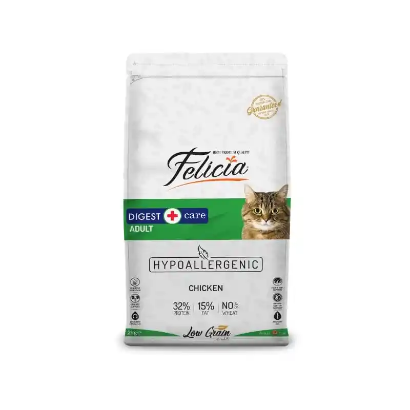 Felicia® Digest Care es un alimento seco Super Premium e Hipoalergénico para gatos, formulado para apoyar la salud y el feliz desarrollo.Combinamos el maravilloso sabor de la auténtica carne de pollo de Inglaterra con el rico contenido de pescado anchoa. De alto sabor y digestibilidad , Felicia® Adult Pollo ha sido especialmente desarrollado para satisfacer todas las necesidades nutricionales de nuestro querido gatito a lo largo de su vida. INGREDIENTES: Proteína de pollo deshidratada (37%), arroz baldo, maíz, aceite de pollo refinado (8%), arveja, harina de anchoa (6%), harina de krill, levadura seca de cerveza, aceite de anchoa (2%), proteína de levadura nucleótidos, minerales, oligosacáridos prebióticos de manano, algas marinas, extracto de yuca, arándano en polvo, psyllium (fibra del plantago).