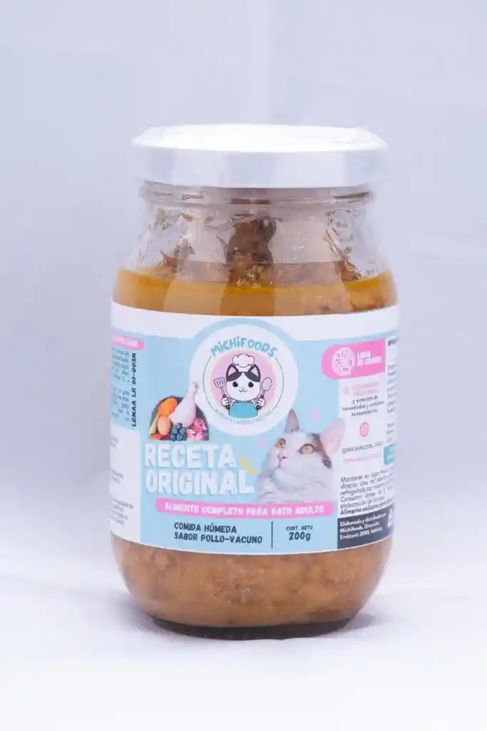Alimento Húmedo Completo Premium Natural para Gato Frasco 200g Receta Original. Ingredientes: Pechuga de pollo, Corazón de pollo, Hígado vacuno, Zapallo, Zanahoria, Apio, Huevo, Jurel, Arándanos, Aceite de Oliva, Vitaminas D y E y Minerales. Todo en sus cantidades justas para que el michi se mantenga sanito, feliz y juguetón. Al ser un alimento húmedo, además de ser más palatable, ayuda a la mejor hidratación del gatito, lo que fortalece su salud. Además de sus altos niveles en proteína de calidad, y baja concentración de carbohidratos (y 0% granos!!), el alimento posee gran cantidad de antioxidantes, vitaminas y micronutrientes descritos como importantes para mantener la salud y prolongar la longevidad en gatos.