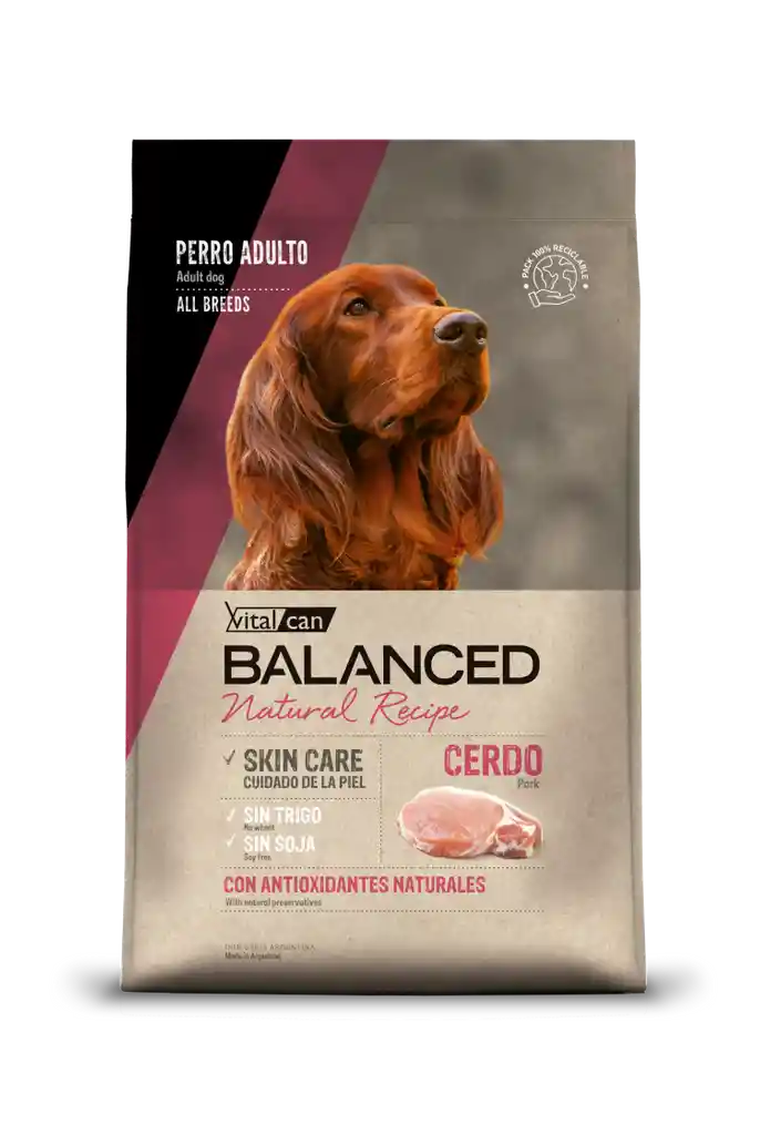 BALANCED NATURAL RECIPE CERDO. Receta monoproteíca a base de Cerdo que contribuye a reducir las reacciones alérgicas. El plus de Omega3 ayuda a mejorar la condición de la piel y los signos digestivos de la intolerancia alimentaria. SKIN CARE: Balance Omega 3 y 6, ácidos grasos esenciales fundamentales para el mantenimiento de una piel sana, humectada y un pelaje brillante. ORAL CARE: Con el agregado de hexametafosfato para ayudar a prevenir el desarrollo de sarro dental. DIGESTIVE PROTECT: Los prebióticos favorecen el desarrollo de bacterias benéficas del intestino, lo que contribuye a mejorar la absorción intestinal, lograr un proceso digestivo óptimo y aumentar las defensas naturales. HEALTHY JOINTS: Con glucosamina y metilsulfonilmetano, que ayudan a proteger el sistema osteoarticular del perro adulto, ya que colaboran con la regeneración y protección del cartílago articular. Ingredientes Harina de carne y hueso de cerdo, arroz, arvejas, gluten meal, aceite de pollo, pulpa de remolacha, hidrolizado de hígado porcino, aceite de pescado, levadura de cerveza, zeolita, sal, inulina, extracto de Yucca schidigera, antioxidantes naturales (extracto de romero, lecitina, tocoferoles), polifenoles, ácido propiónico, paredes de levadura, glucosamina, metilsufonilmetano, nucleótidos de levadura, hexametafosfato de sodio. Vitaminas: A, D3, E, K3, B1, B2, B6, B12, colina, biotina, ácido fólico, ácido nicotínico, ácido pantoténico, vitamina C. Minerales: yodo, hierro, manganeso, cobre, selenio y zinc.