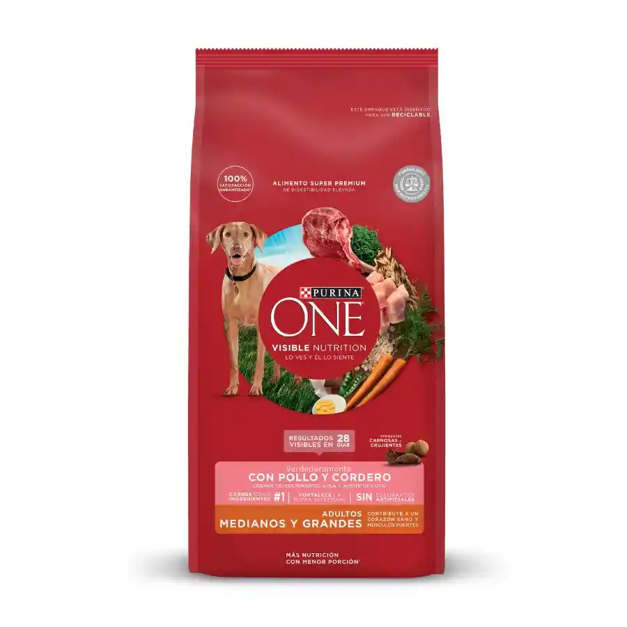 Alimento seco para perros adultos medianos y grandes con pollo y cordero como primer ingrediente. Incluye probióticos naturales para mejor digestión y heces más firmes, Omega-3 de alga y aceite de coco como fuente de energía. Resultados visibles en 28 días y sin colorantes artificiales.