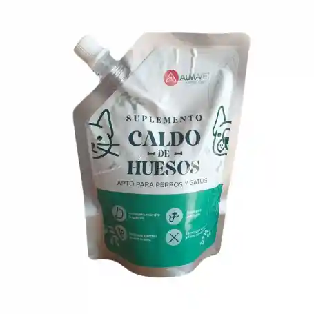 Suplemento natural líquido de caldo de huesos, ideal para fortalecer articulaciones, mejorar la digestión y estimular el apetito de perros y gatos.