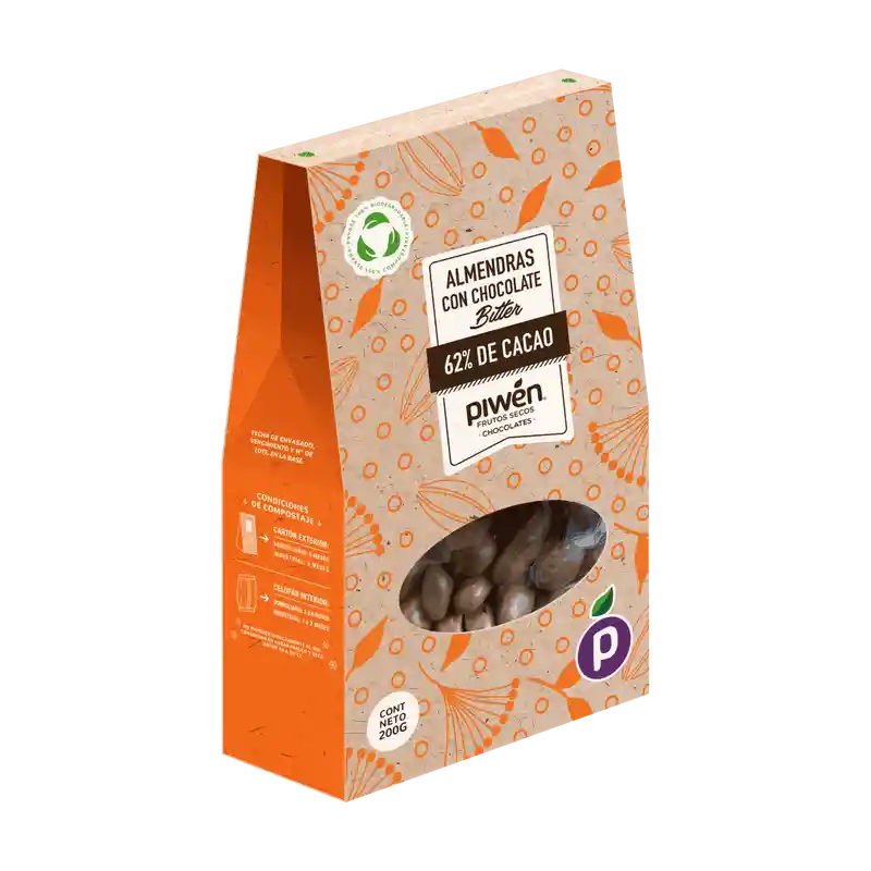 ¡Nuevo Envase 100% Comportable! Sorprende a tu paladar con esta exquisita selección de almendras enteras bañadas en una suave capa de chocolate Bitter (62% cacao). El snack perfecto para los amantes de los frutos secos y el chocolate. ¡Disfrútalas en cualquier momento del día! Ingredientes: Cobertura chocolate bitter (pasta de cacao, azúcar, emulsionantes (lecitina de soya, polirricinoleato de poliglicerol), sabor idéntico al natural), Almendra, azúcar impalpable, sellante (alcohol etílico, goma laca, aceite vegetal), abrillantador (jarabe de glucosa, agua, goma arábiga, ácido cítrico, sorbato de potasio). Puede contener: Soya, Maní, Leche, Sulfitos, Huevo, otros frutos secos, Sésamo, Mostaza y Lupino.
