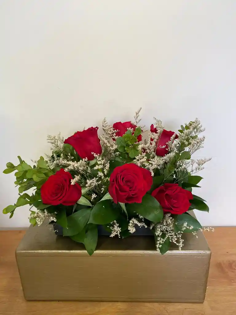 Almohada realizada con Rosas Rojas (8), Limoniúm y Ruscus