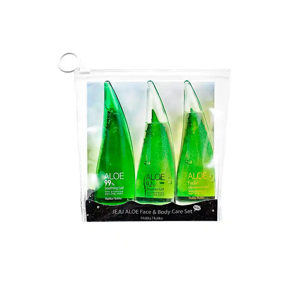 Este set contiene tres de los productos estrella de Holika Holika: Aloe Facial 92% Cleansing Foam: espuma limpiadora de aloe vera que elimina las impurezas e hidrata el rostro en profundidad y Aloe Soothing Gel 99% gel hidratante de aloe vera que sirve para rostro, cuerpo y pelo. Aloe 92% Shower Gel: gel de ducha con un 92% de áloe vera.