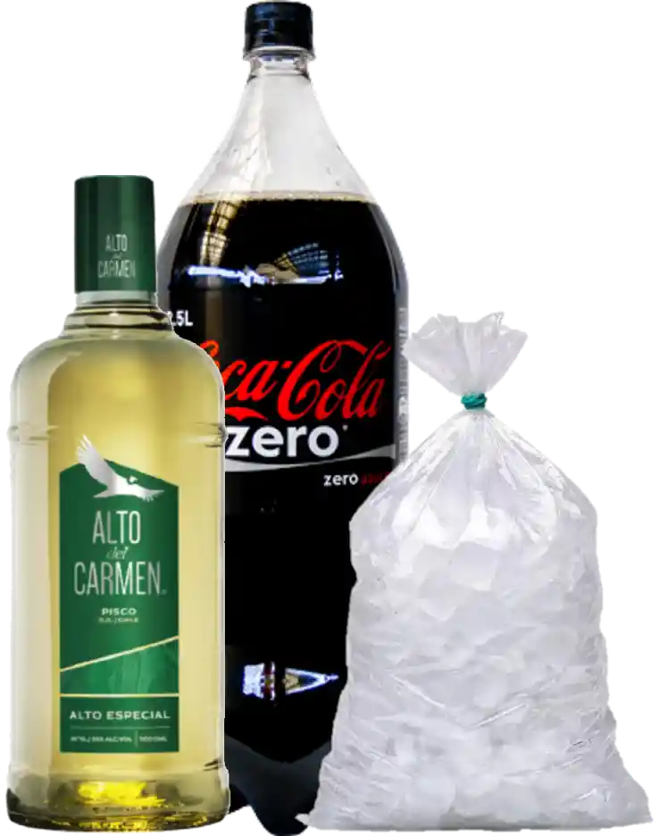 Pack alto pisco alto del carmen 35° 1lt con cocacola desechable zero de 3lt y 1kg de hielo