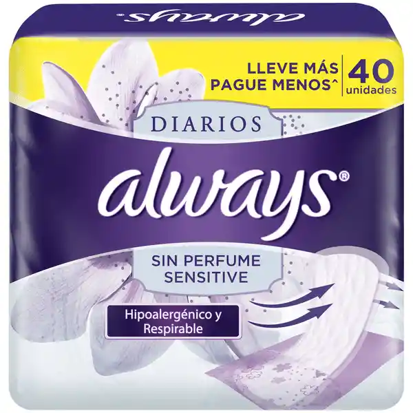 Para los días de flujo ligero o como respaldo para las fugas menstruales, pruebe los protectores diarios Always Diarios Sensitive para su comodidad durante todo el día. Estos protectores diarios te ayudarán a sentirte limpia y seca todos los días, son Hipoalergénicos, respirables y ayudan a proteger tu piel íntima contra la irritación. Los protectores diarios Sensitive de Always son cómodos para usar todos los días del mes. En Always creemos que todas las mujeres merecen mucho más que el status quo, por lo que trabajamos sin descanso para proporcionarles productos innovadores que las mantendrán imparables todos los días.