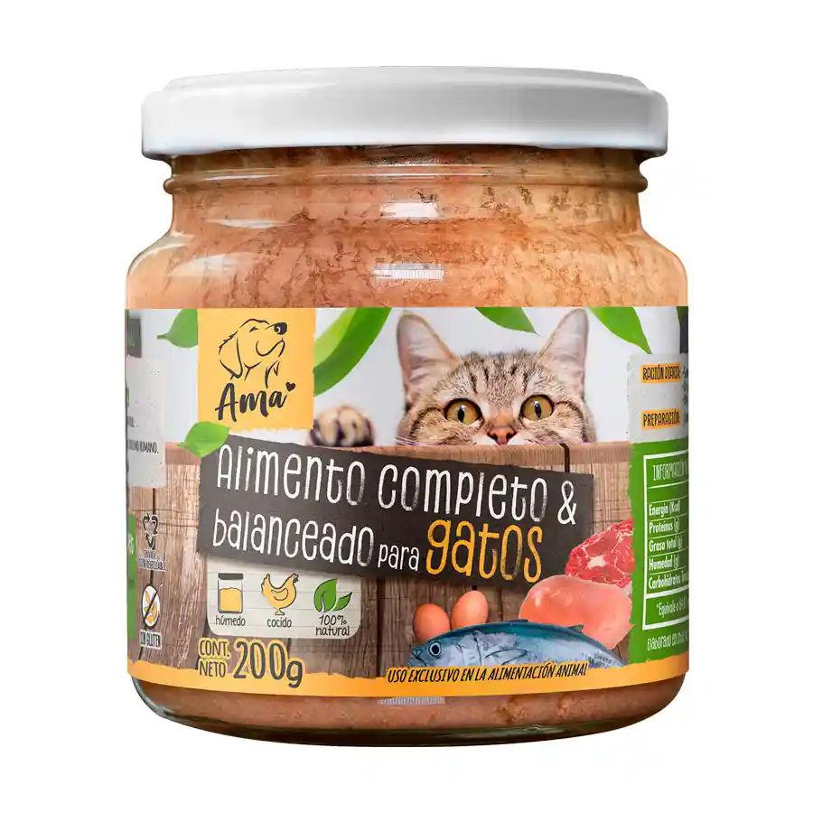 AMA ALIMENTO NATURAL PARA GATOS es un alimento húmedo, esterilizado y elaborado en base a componentes naturales. Completo y balanceado para gatos adultos sanos. Sin preservantes, colorantes ni sal añadida. Formulado por médicos veterinarios especialistas en nutrición natural. Las características de este producto son: Proteína de excelente valor biológico y disponibilidad. Importante aporte de minerales, hierro, zinc y vitaminas del complejo B. Contiene probióticos. Buena relación Omega 3 y 6. Adecuada relación calcio y fósforo. Libre de gluten. Contiene humedad similar a una presa en condiciones naturales. Previene patologías renales. Insumos adquiridos en establecimientos autorizados para el consumo humano. Consulte con su médico veterinario antes de suministrar.