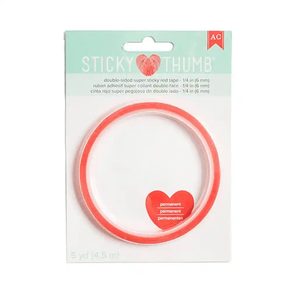 American Crafts-Sticky Thumb Cinta roja superadhesiva de doble cara. ¡Perfecto para colocar adornos pesados! Pegue de forma permanente casi cualquier cosa con esta cinta adhesiva de doble cara ultraadhesiva. Este paquete contiene un rollo de 5 yardas de cinta adhesiva roja súper adhesiva de doble cara de 1/4 de pulgada de ancho. Importado.
