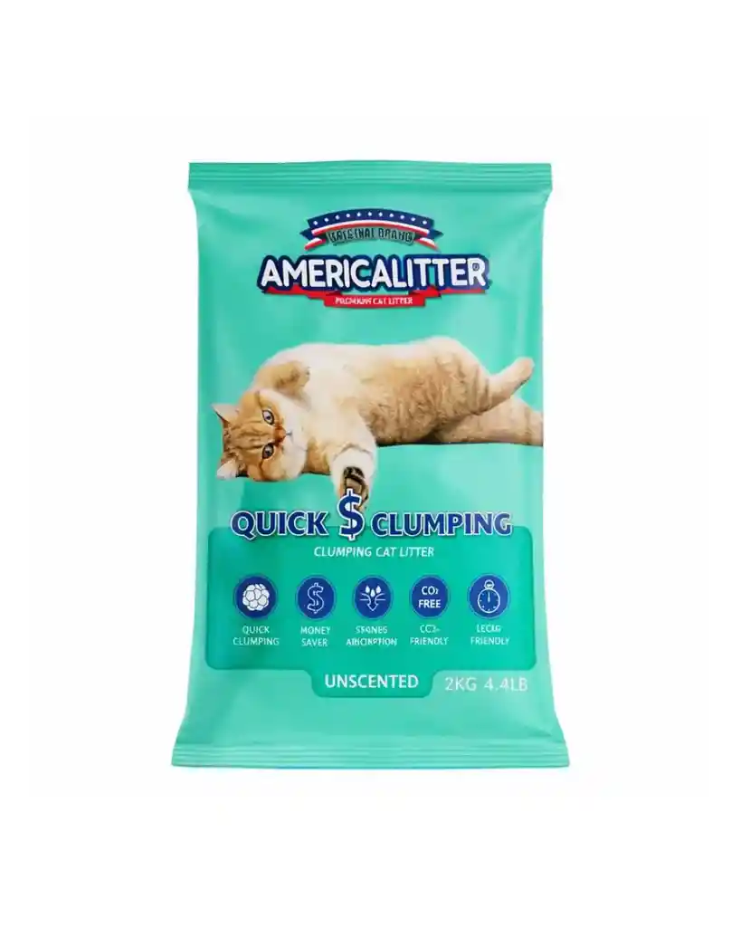 ARENA SANITARIA AMERICALITTER QUICKCLUMPING SIN AROMA 2KG que utiliza una fórmula de composición de bentonita ...Ver más