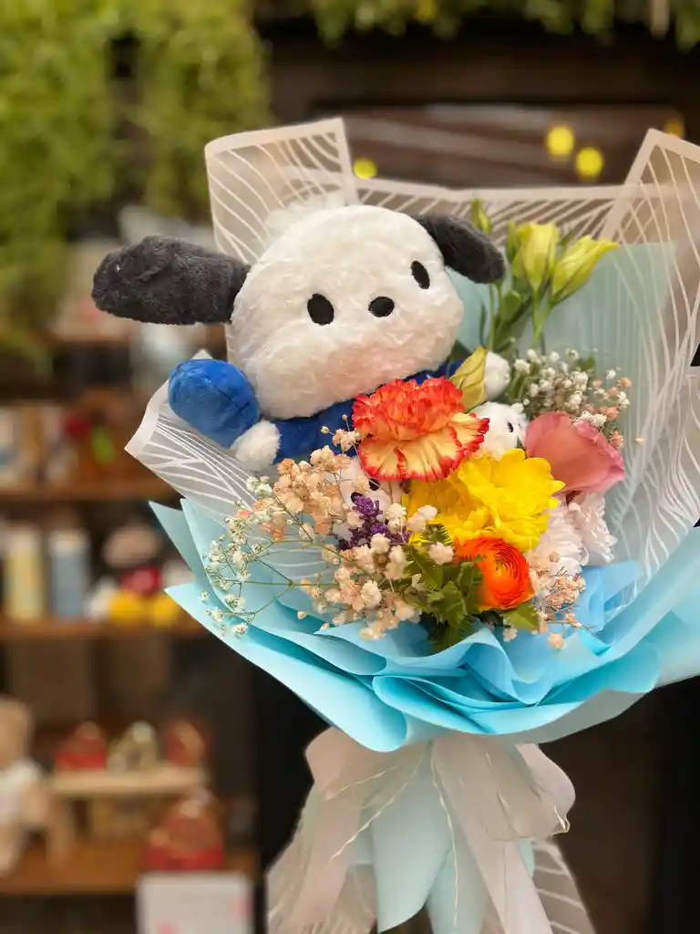 Crea su propia magia con nuestro Ramo Magia Personalizable! Este encantador bouquet está diseñado para deleitar a los pequeños (y no tan pequeños) con su personaje Sanrio favorito y flores a su medida. Puedes elegir entre: Pochaco: Acompañado de vibrantes flores en tonos celestes y damascos, creando una combinación divertida y fresca. Melody: Rodeada de delicadas flores en tonos blancos y rosados, para un estilo dulce y romántico. Cinnamon: Envuelto en suaves flores en tonos blancos y pasteles, que evocan ternura y ligereza. Cada ramo incluye un adorable peluche inspirado en Sanrio de 23 cm a tu elección, cuidadosamente presentado con papeles y flores que complementan a la perfección a tu personaje elegido. ¡El regalo ideal para un abrazo y una sonrisa inolvidable!