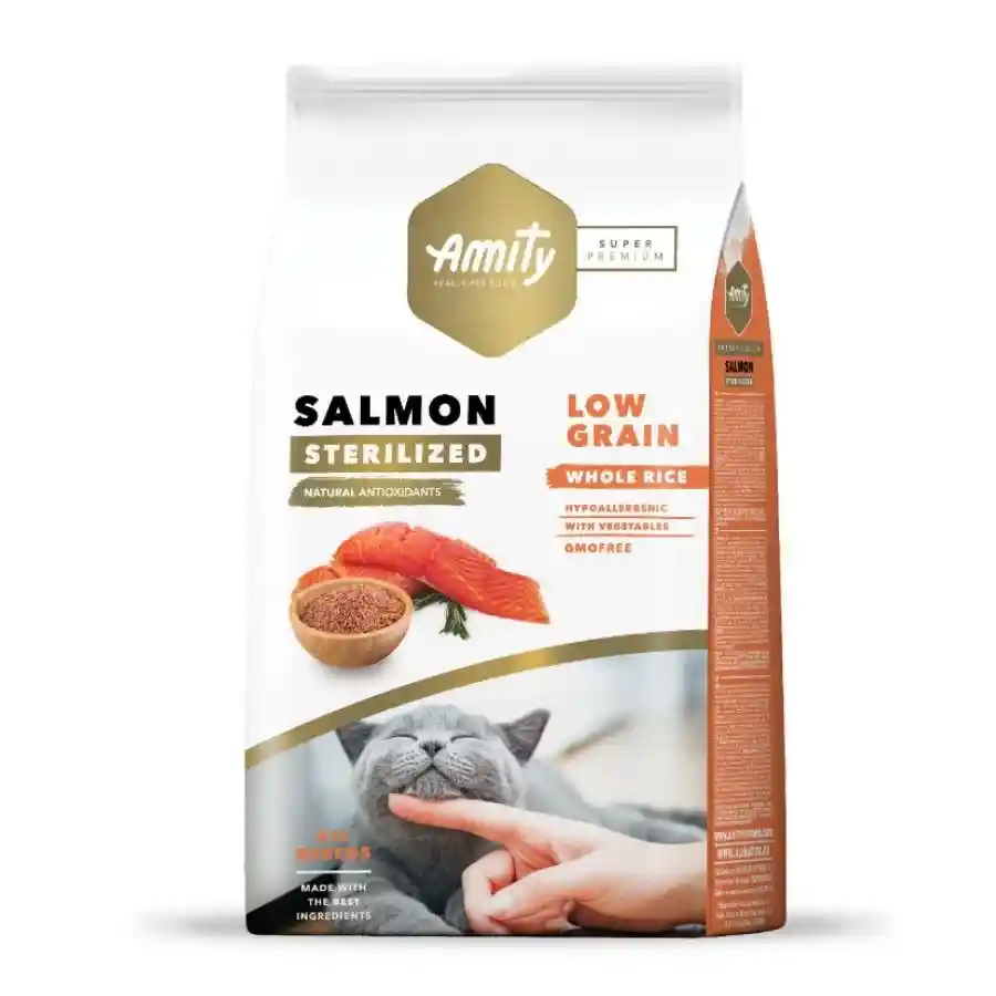 AMITY SP LOW GRAIN SALMON ADULT CAT STERILIZED es un alimento de origen español, guiado por las mas estrictas normas europeas, logrando un alimento completo y balanceado para las mascotas. Amity solo utiliza ingredientes naturales, sin colorantes, saborizantes o preservantes artificiales. Su primer componente es carne deshidratada, siendo una excelente fuente de proteína. Amity solo utiliza arroz integral como fuente de carbohidratos y fibra, el cual es un grano noble, de bajo índice glucémico y alergeno. Gracias a su pellet cuidadosamente elaborado, es apto para gatos de todo tipo de razas y tamaños, de esta forma Amity es la opción ideal para todos los miembros peludos de la familia.