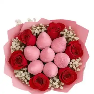 RAMO DE 6 FRUTILLAS BAÑADAS EN CHOCOLATE BLANCO CON TINTA ROSADA (COMESTIBLE), Y 6 ROSAS NATURALES REALES