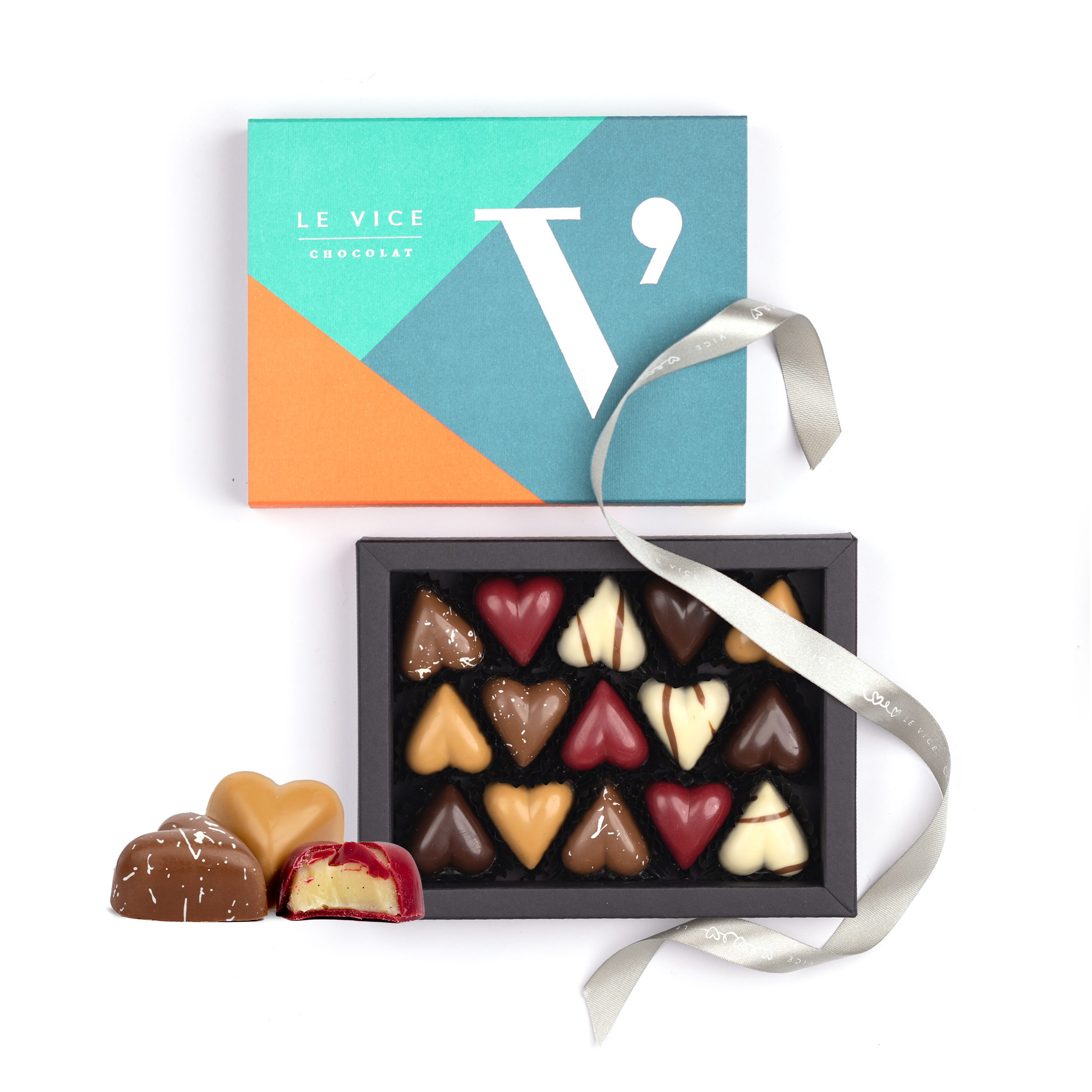 Sorprende a tu pareja con esta increíble caja de corazones exclusivos Le Vice. En esta ocasión nuestros sabores exclusivos para San Valentín son los siguientes: Chocolate blanco ecuatoriano relleno en dulce de leche Chocolate gold macizo Chocolate de leche macizo Chocolate negro 64% cacao relleno en nuestro inconfundible praliné de avellanas Chocolate inspiración frambuesa (¡el color rojo es natural proveniente de la frambuesa!) relleno en ganache de Vainilla Madagascar Nuestros productos son elaborados en nuestro taller de forma 100% artesanal, por lo que siempre contamos con stock limitado. Te recomendamos hacer tu compra cuanto antes para reservar tu producto exclusivo, ya que en otras ocasiones siempre agotamos stock.