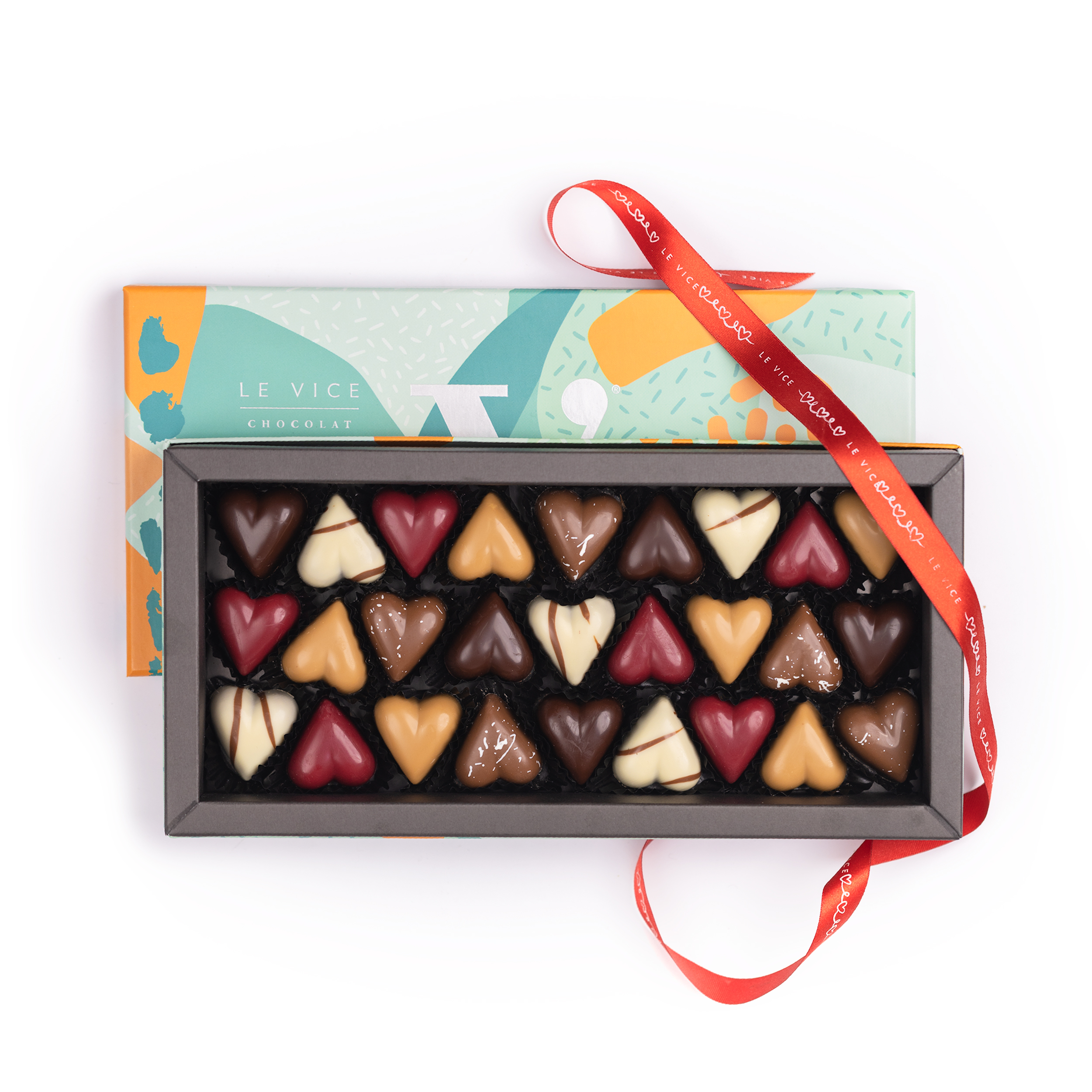 Sorprende a tu pareja con esta increíble caja de corazones exclusivos Le Vice. En esta ocasión nuestros sabores exclusivos para San Valentín son los siguientes: Chocolate blanco ecuatoriano relleno en dulce de leche Chocolate gold con notas de caramelo macizo Chocolate de leche macizo Chocolate negro 64% cacao relleno en nuestro inconfundible praliné de avellanas Chocolate inspiración frambuesa (¡el color rojo es natural proveniente de la frambuesa!) relleno en ganache de Vainilla Madagascar