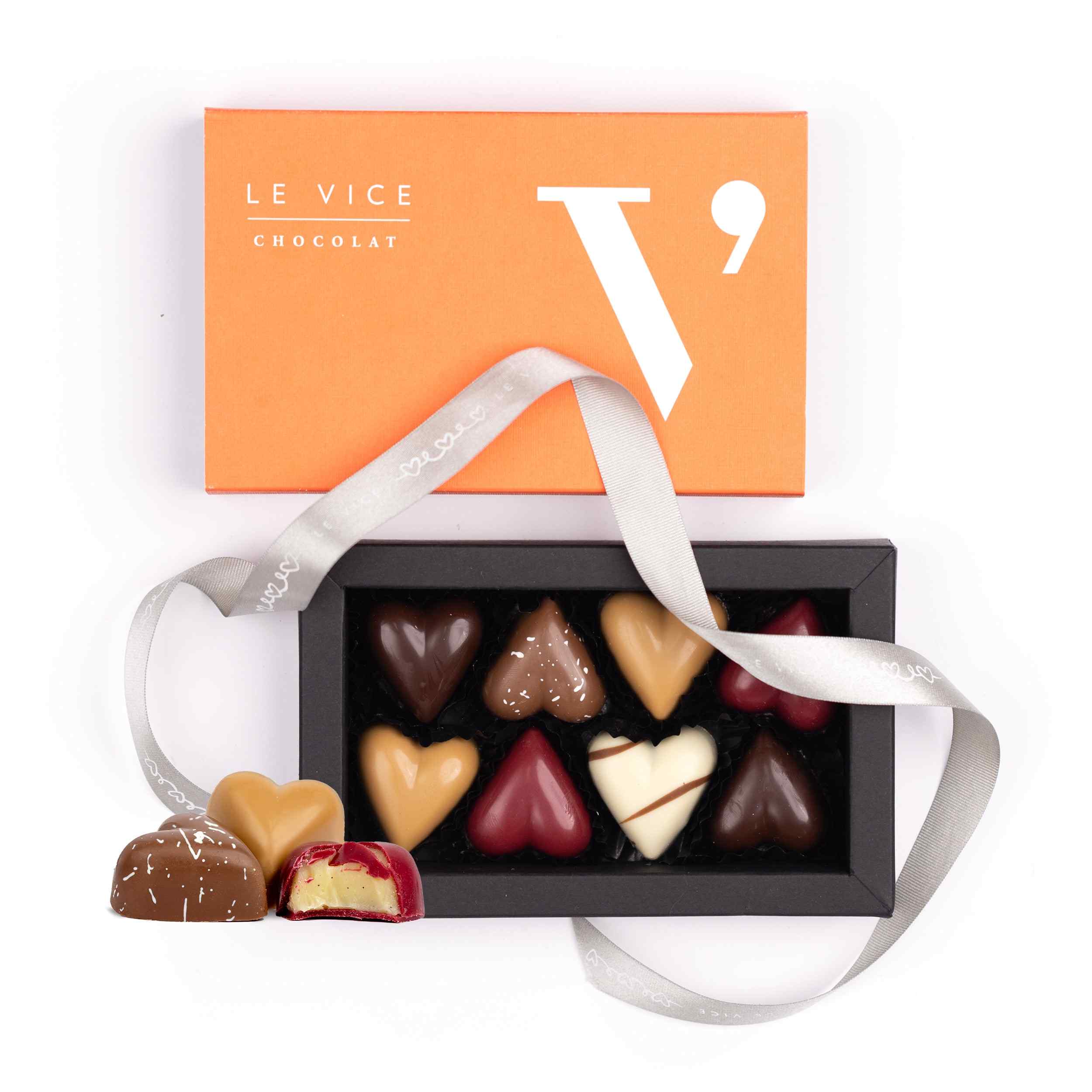 Sorprende a tu pareja con esta increíble caja de corazones exclusivos Le Vice. En esta ocasión nuestros sabores exclusivos para San Valentín son los siguientes: Chocolate blanco ecuatoriano relleno en dulce de leche Chocolate gold con notas de caramelo macizo Chocolate de leche macizo Chocolate negro 64% cacao relleno en nuestro inconfundible praliné de avellanas Chocolate inspiración frambuesa (¡el color rojo es natural proveniente de la frambuesa!) relleno en ganache de Vainilla Madagascar