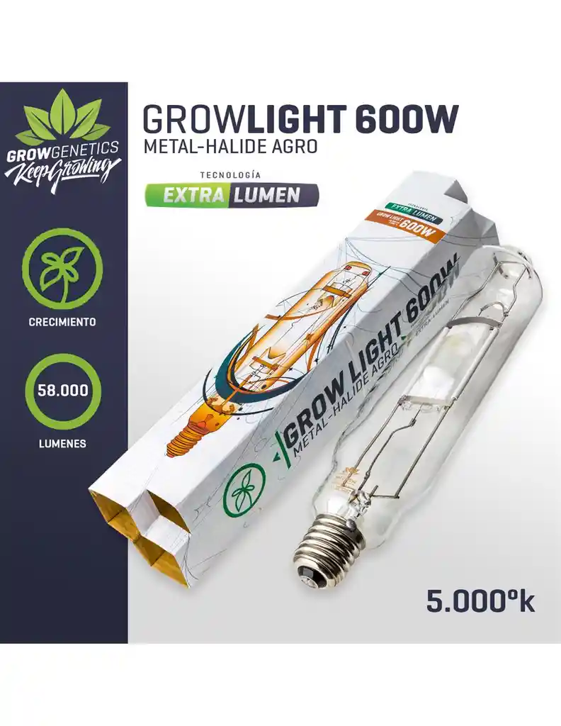 La ampolleta de Haluro Metal de la línea AGRO de Grow Genetics fue diseñada y optimizada específicamente para cubrir los requerimientos de una planta en crecimiento. Su tecnología de Extra lumen le permite soportar un 10% más de carga lo que se traduce en un mayor flujo lumínico, entregando 45.000 lumens por 600 watts de poder. Si bien, las ampolletas Grow Genetics funcionan perfectamente con todos los ballast del mercado, ésta se encuentra optimizada para el Ballast Fireball 600W Extra lumen de Grow Genetics, con el que obtendrás el máximo provecho para tu cultivo.