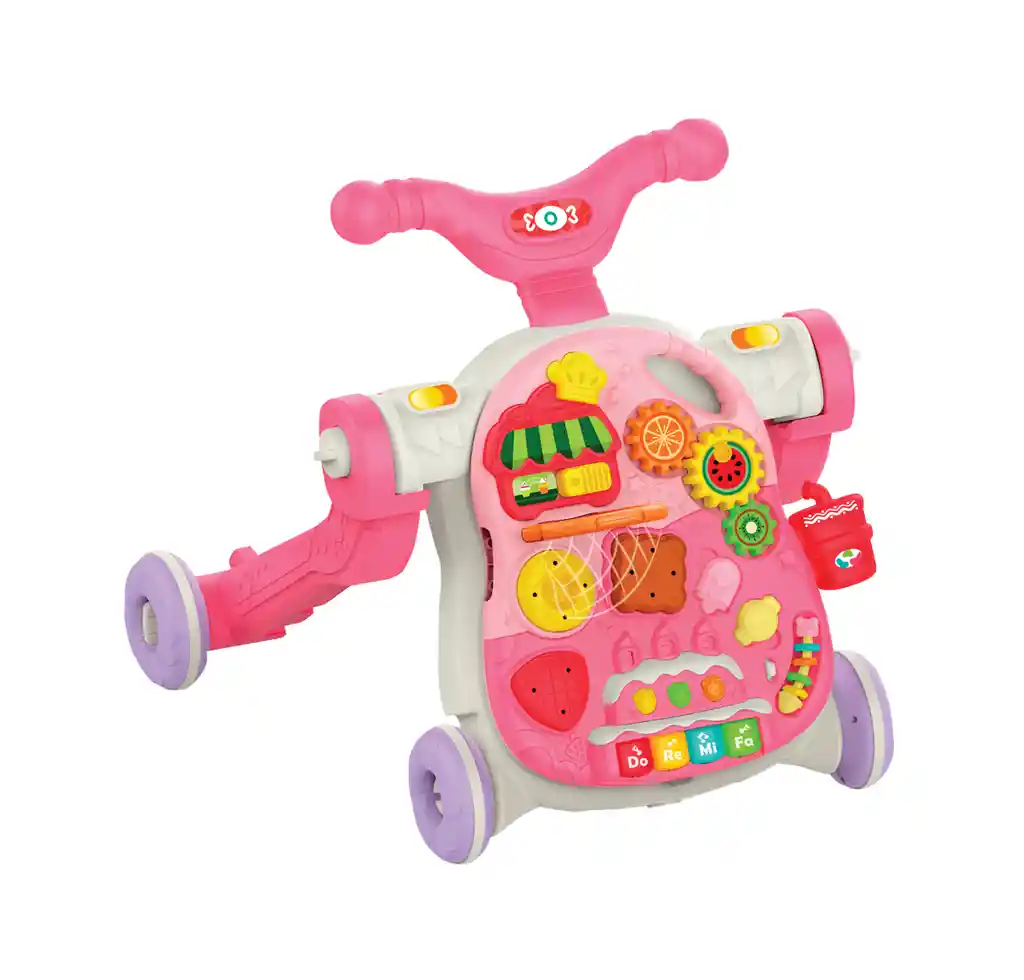 Caminador multifuncional 4 en 1, funciona como: Andador, triciclo, scooter y mesa de juego Permite ejercitar los dedos y la motricidad fina Hecho de material ABS durable y no tóxico Permite el entrenamiento en el sentido del tacto, también el entrenamiento visual, cognitivo y físico Medidas: 46 x 43 x 44 cm