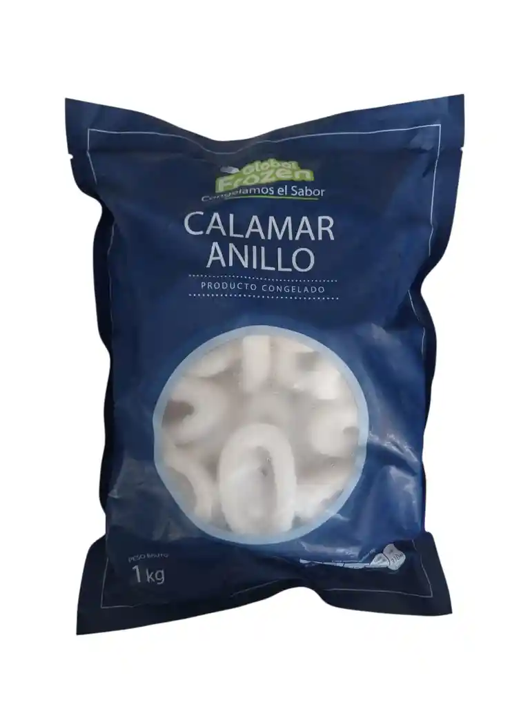 Calamar cortado en forma de anillas individualmente. Producto congelado
