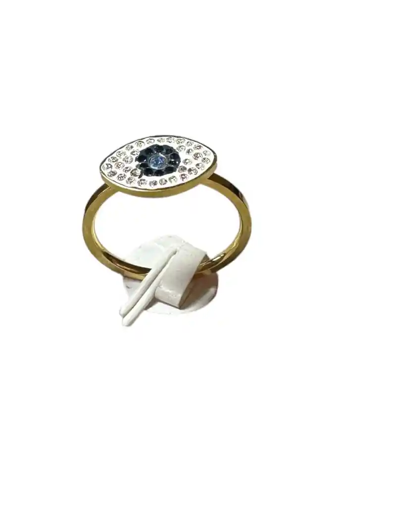 Anillo de acero dorado con cristales translucidos y centro azul de 5mm, dispuestos en engaste Pointiage . Que otorga un sofisticado efecto contraste entre la cerámica y el cristal. Única Talla 8 Tabla disponible en la ultima foto.