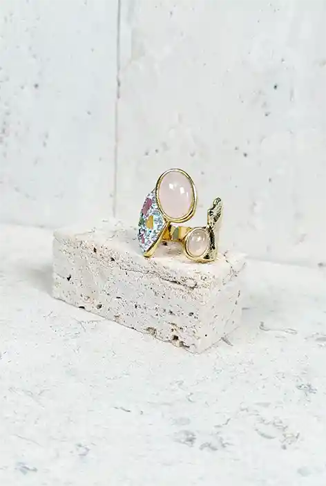Este anillo asimétrico es una obra de arte moderna en tu mano, con dos cuarzos rosados prominentemente engastados en bisel. El diseño se enriquece con turmalinas de varios tonos y una base resplandeciente de mini strass que capturan la luz con cada movimiento. Esta pieza no solo es un adorno llamativo, sino también una declaración de estilo personal.