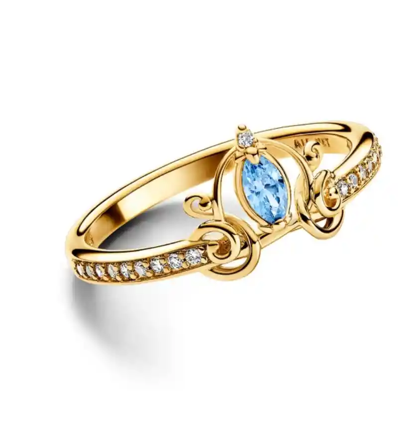 La medianoche es solo el principio. Prepárate para el baile con el Anillo Carroza de Cenicienta de Disney, que muestra en el centro una gema azul con forma de marquesa. Los detalles de filigrana forman el motivo de la carroza encantada y lo conectan con el eje del anillo, que se ha embellecido con brillantes circonitas cúbicas transparentes en pavé hasta la mitad. Combínalo con tus joyas favoritas en tonos dorados o con otros diseños inspirados en Cenicienta para crear estilos que brillarán con la misma intensidad antes Y después de medianoche.