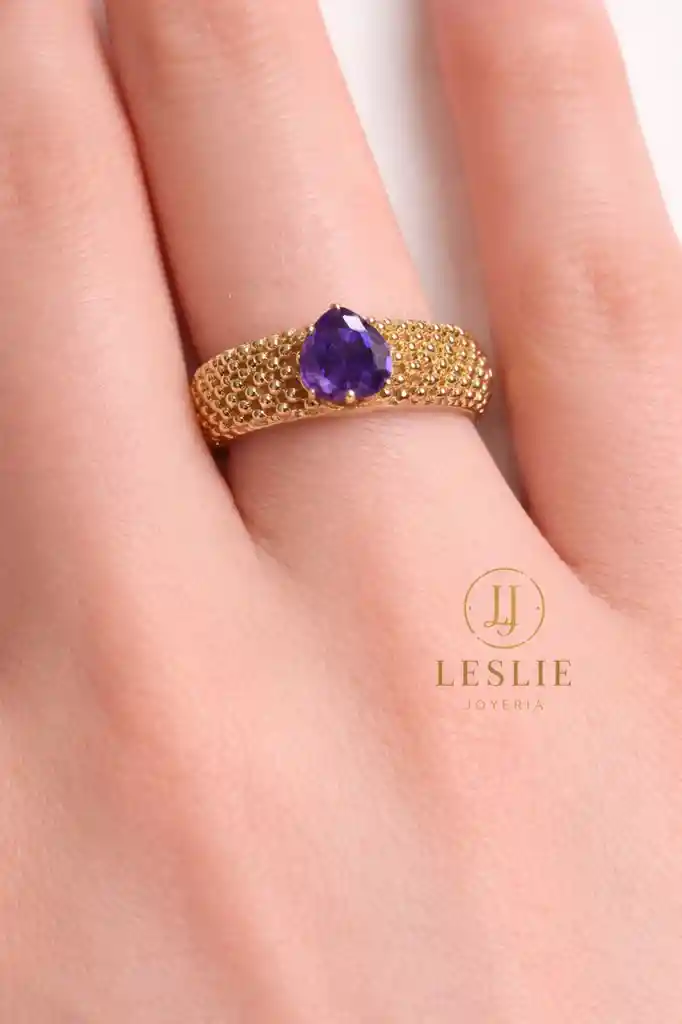 Anillo con precioso diseño cristal morado laminado en oro de 18k talla 7.