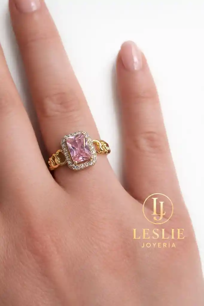 Anillo elegante con cristal rosado y micro circones laminado en oro color rose de 18k talla 8.