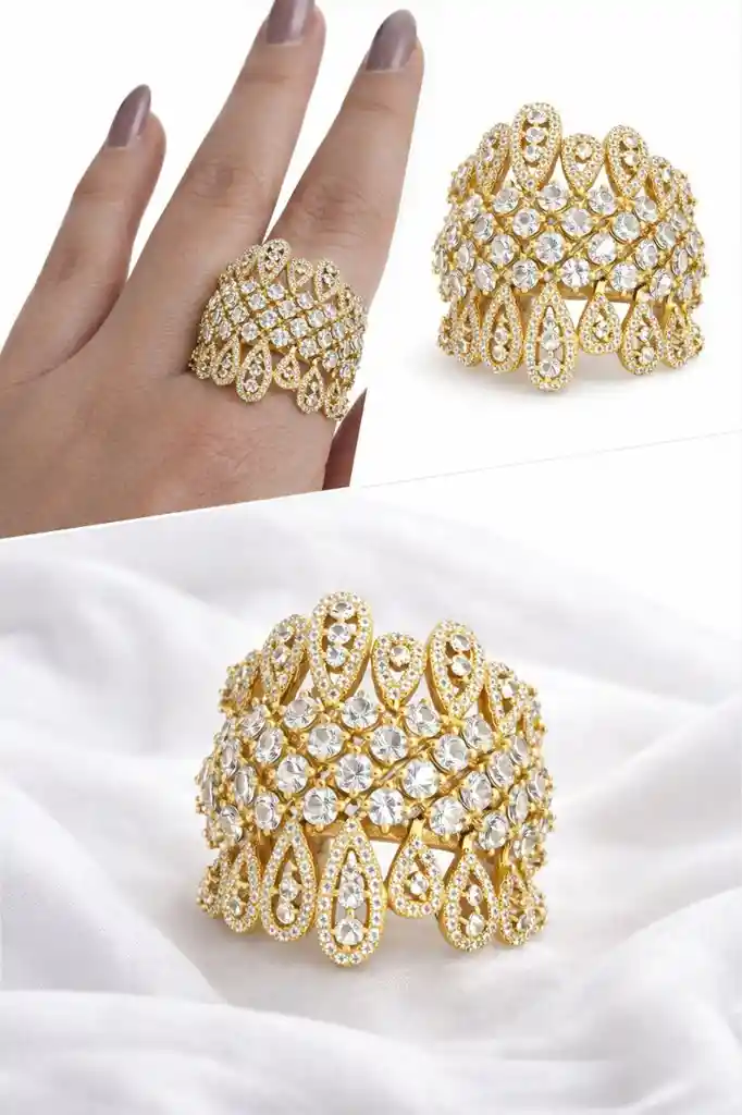Anillo con hermoso diseño de micro circones y cristales laminado en oro de 14k talla 9