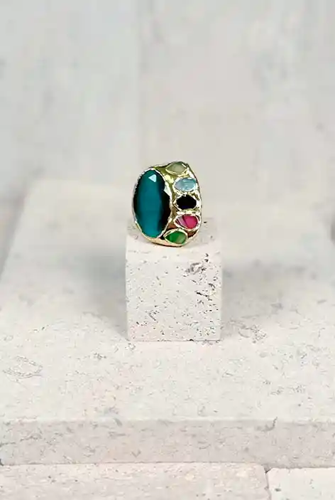 Este anillo XL captura la esencia de la primavera con su vibrante despliegue de ágatas semipreciosas naturales. En un lado, luce una imponente piedra con corte de hoja, mientras que el otro está adornado con cinco piedras más pequeñas en una paleta de colores que va desde suaves pastel hasta tonos vibrantes. Todas las gemas están meticulosamente incrustadas en un soporte de metal dorado de forma irregular, añadiendo un toque único y artístico. El anillo tiene un buen peso, lo que confirma la calidad de los materiales utilizados y proporciona una sensación de solidez y confort al usarlo.