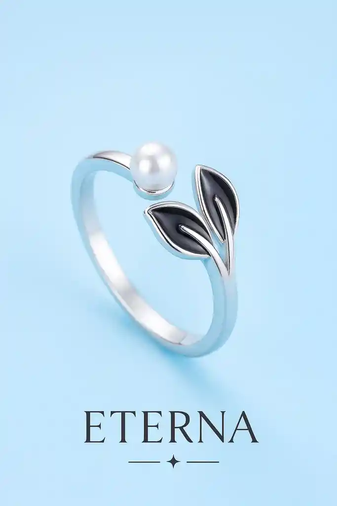 Anillo ajustable en plata con perla y hojas negras. Elegante, cómodo y adaptable a cualquier talla.
