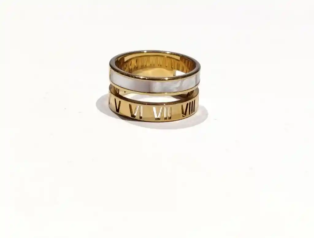 Anillo dorado elegante con franja nacarada y detalles de números romanos. Diseño clásico y moderno a la vez, ideal para complementar cualquier estilo. TALLA 8