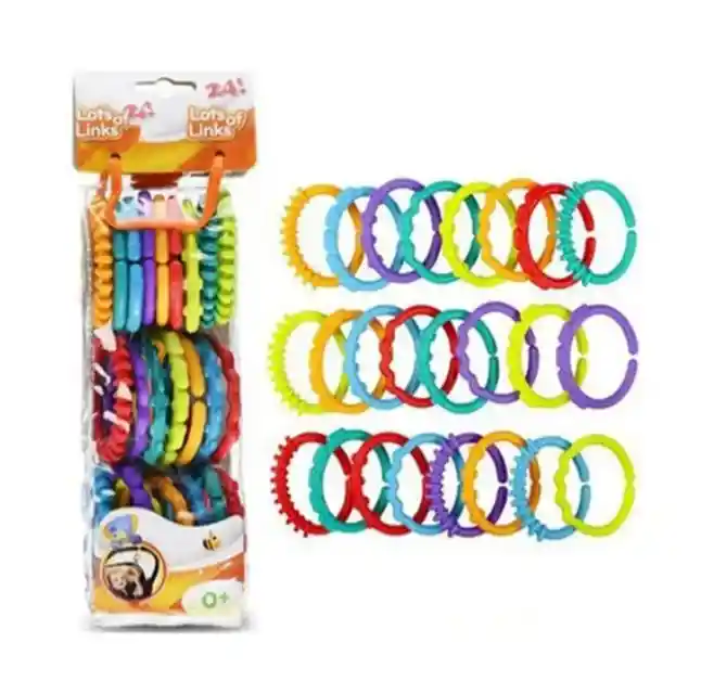 Anillos Clip en educación temprana, Aprendizaje, Juego de accesorios de viaje, Enlaza cuelga y gira El juego Plastic incluye 24 eslabones de colores que facilitan colgar juguetes de viaje para bebés en cochecitos, cunas y bolsas de pañales Los eslabones vienen en seis colores diferentes y cuentan con una variedad de diferentes formas moldeadas