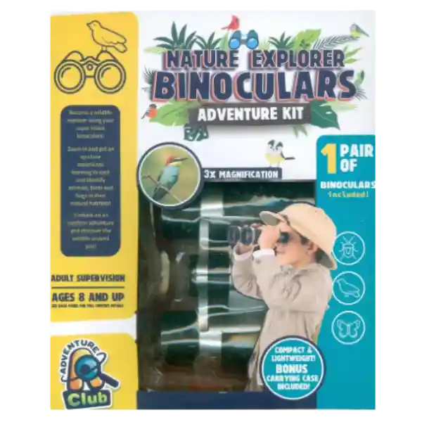 Conviértete en explorador de vida silvestre nunca fue tan entretenido, utiliza los binoculares de supervisión y vive una experiencia única aprendiendo a detectar e identificar animales, aves e insectos en sus hábitats naturales. ¿Sabías? Los binoculares son en realidad dos telescopios refractores montados uno al lado del otro. Esto permite al espectador utilizar ambos ojos y tener visión binocular. Cuando alguien mira a través de un par de binoculares la luz entra a través de una lente llamada lente objetivo en cada lado. El conjunto incluye Binoculares, Correa, Bolsa para guardar. Se recomienda de 6 años en adelante.