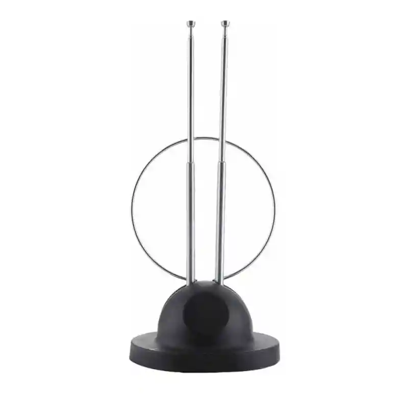 ANTENA TV TIPO OREJAS DE CONEJO Con esta antena podrás conectar tu televisión a la señal local sin problemas fácil de usar y montar. 4 Secciones Abierta 80cm Anillo 13cm Cable Coaxial Conector RF Rápido