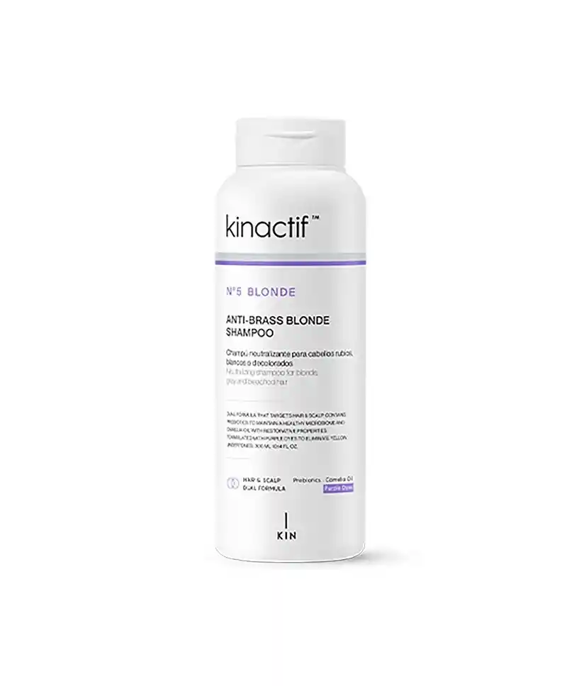 Los cabellos rubios, blancos y decolorados necesitan un mantenimiento para preservar un rubio frío y luminoso, que a la vez, cuide la salud del cabello y del cuero cabelludo. KINACTIF™ N°5 BLONDE neutraliza los reflejos amarillentos no deseados, aportando un reflejo frío y devolviéndole el brillo perdido, mientras restaura la suavidad de la fibra capilar. Origen: España Formato: 300 ml.