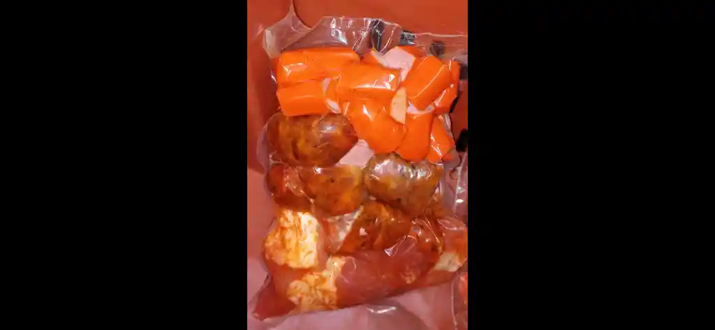 Carne cerdo longaniza salchicha todo aliñado salen 5 pinchos de cada paquete