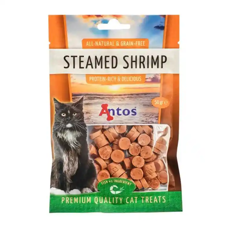 ANTOS - STEAMED SHRIMP GRAIN FREE (SNACK PARA GATOS DE CAMARON LIBRE DE GRANOS) 50 GR Mima a tu amigo con el delicioso sabor de los camarones. Nuestro Cat Treats Steamed Shrimp contiene camarones como primer ingrediente, una fuente de proteínas y aminoácidos de alta calidad para ayudar a desarrollar y mantener los músculos de tu gato. Las golosinas sin azúcar son excelentes para todas las etapas de la vida. Bolitas de camarón al vapor, mono proteicas. Alto porcentaje de carne, textura suave, con un formato pequeño ideal para entregar en los paseos o enseñar trucos. Formato de 50 gramos.