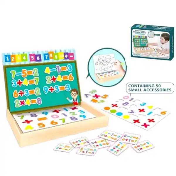 Tablero 2 en 1 reversible que se despliega desde la tapa! Por un lado, sumérgete en un emocionante mundo magnético donde podrás aprender operaciones matemáticas con tarjetas. Por el otro lado, desata tu creatividad en una pizarra blanca lista para dibujar y escribir con el marcador incluido. Medidas: 27x20cm caja
