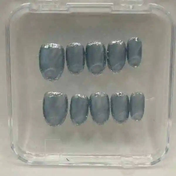 Uñas hechas a mano en tono azul hielo con acabado brillante y marco de glitter plateado Forma: Ovalada, Talla: S Kit Incluye: 10 uñas, 24 stickers, lima, palo de cuticula, alcohol pad. 100% veganas, libres de crueldad animal, listas en 10min y duran hasta 2 semanas.