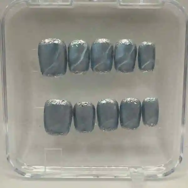 Uñas hechas a mano en tono azul hielo con acabado brillante y marco de glitter plateado Forma: Cuadrada, Talla: S Kit Incluye: 10 uñas, 24 stickers, lima, palo de cuticula, alcohol pad. 100% veganas, libres de crueldad animal, listas en 10min y duran hasta 2 semanas.