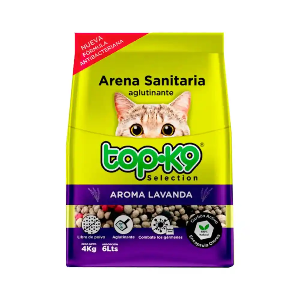 . Arena Sanitaria Aglutinante Antibacteriana Top K9 es una gravilla mineral 100% natural. . Absorbe en 8 segundos aproximadamente la orina de su gato transformándola en una bolita fácil de retirar. . Ideal para ofrecerle a tu gatito una mayor frescura e higiene en el arenero. . Posee partículas de carbón activo que eliminan el 99% de los desagradables olores y baking soda que ayuda a eliminar un 99% las bacterias, además de indicadores coloreados de aroma. Especificaciones: - Marca: Top K9. - Aroma: Lavanda. - Empaque: 1 Bolsa de 4 kg.