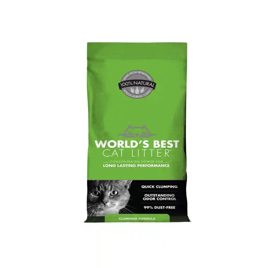 Worlds Best Cat Litter WBCL Clumping Formula es una arena sanitaria para gatos que utiliza un proceso patentado para comprimir el maíz naturalmente absorbente, en gránulos concentrados que atrapan el olor profundo en el interior y forman grupos apretados al contacto, para que pueda absorber más y desperdiciar menos. 100% Natural – 110% Rendimiento.