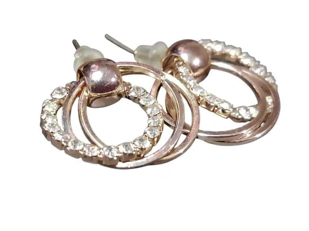 Arete colgante en tono oro rosa compuesto por argollas superpuestas que crean un juego de profundidad y movimiento. Una de las argollas incorpora brillos cuidadosamente engastados que aportan luz y contraste, mientras la estructura pulida mantiene un equilibrio elegante y moderno. Una pieza con presencia sutil, ideal para destacar con sofisticación y un toque contemporáneo