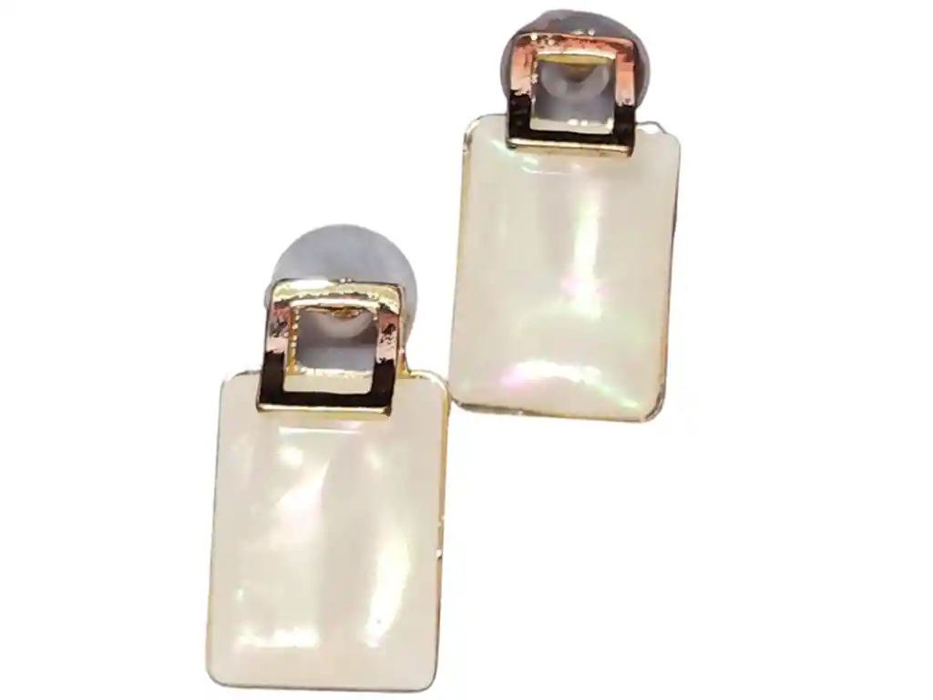 Arete rectangular con superficie nacarada de reflejos suaves, enmarcado por un borde dorado que realza su forma y carácter. Una pieza de estética limpia y contemporánea, pensada para quienes buscan un accesorio con presencia sutil, capaz de aportar equilibrio, luz y estilo sin esfuerzo. Ideal para looks modernos y bien definidos