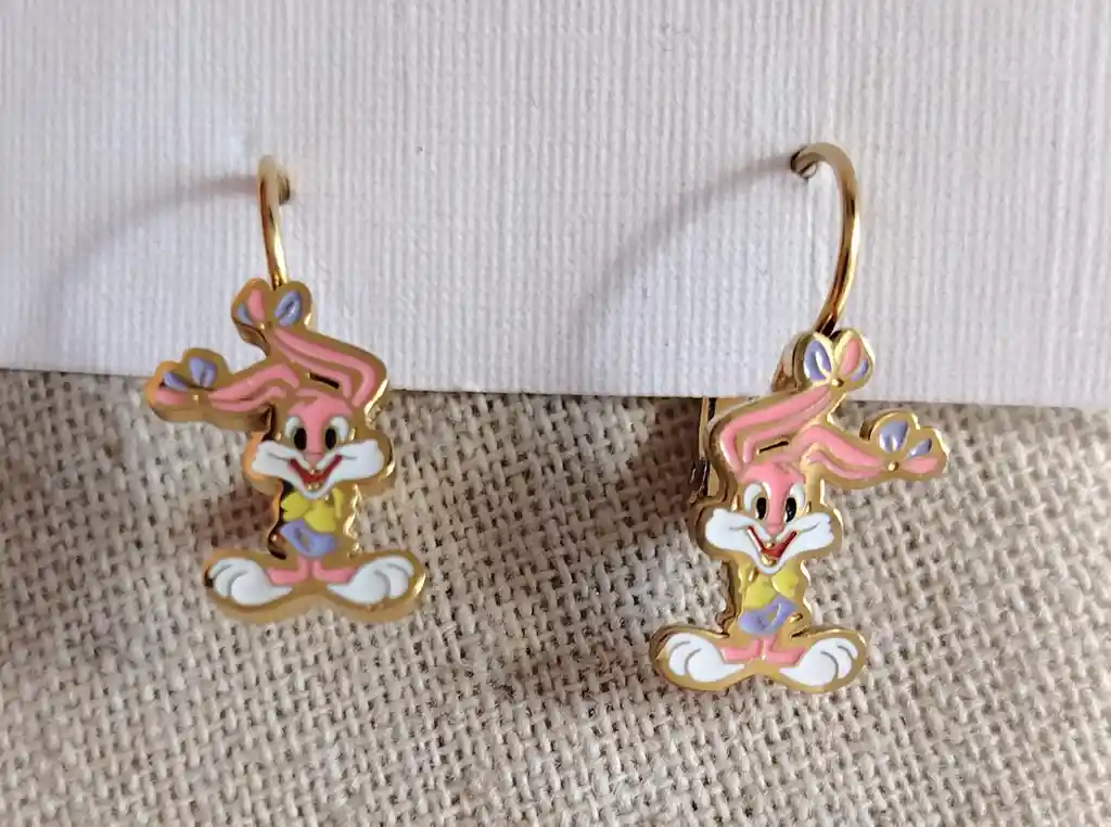 Aretes colgantes bañados en oro con diseño de conejita en tonos rosados y detalles esmaltados, divertidos y llenos de color.