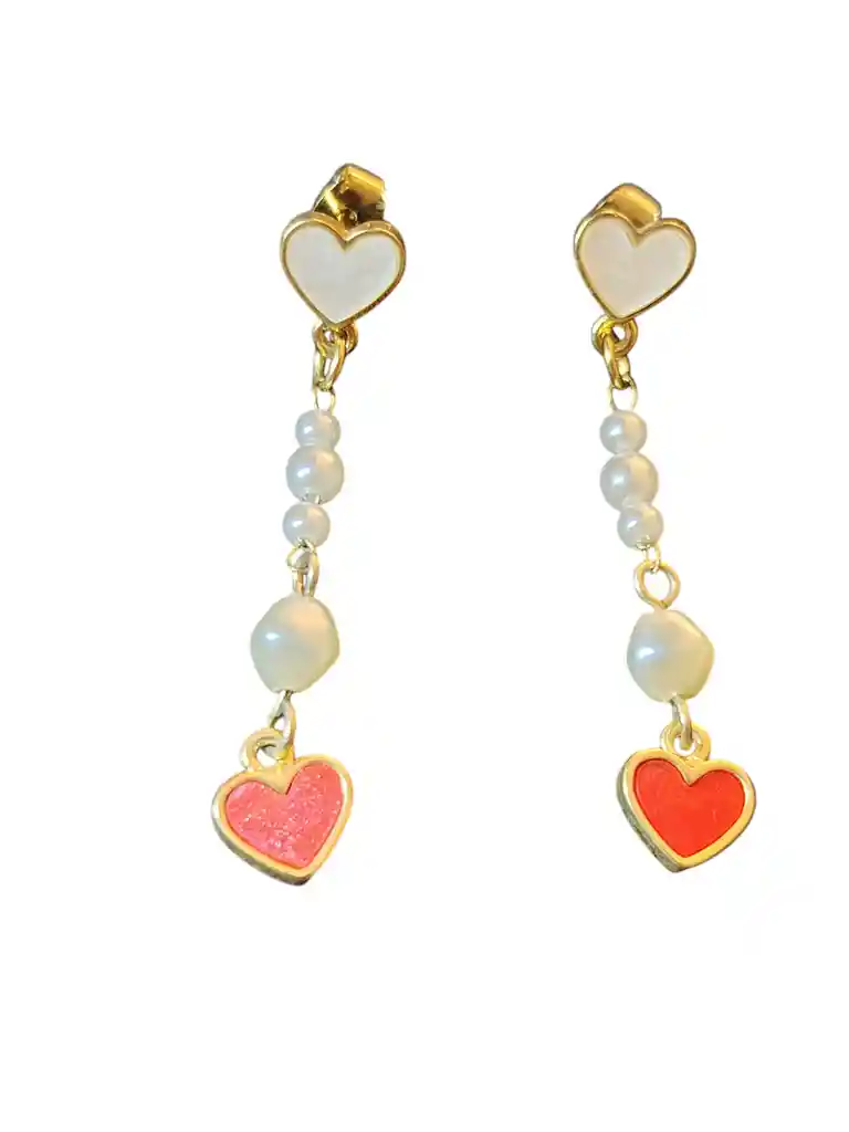 Aretes colgantes de diseño romantico con corazones en tono rojo y delicadas perlas blancas. Un accesorio femenino y llamativo que combina dulzura y elegancia, ideal para dar un toque especial a cualquier outfit. Livianos y comodos, perfectos para el dia a dia o ocasiones especiales, manteniendo la esencia delicada de cafunè studio