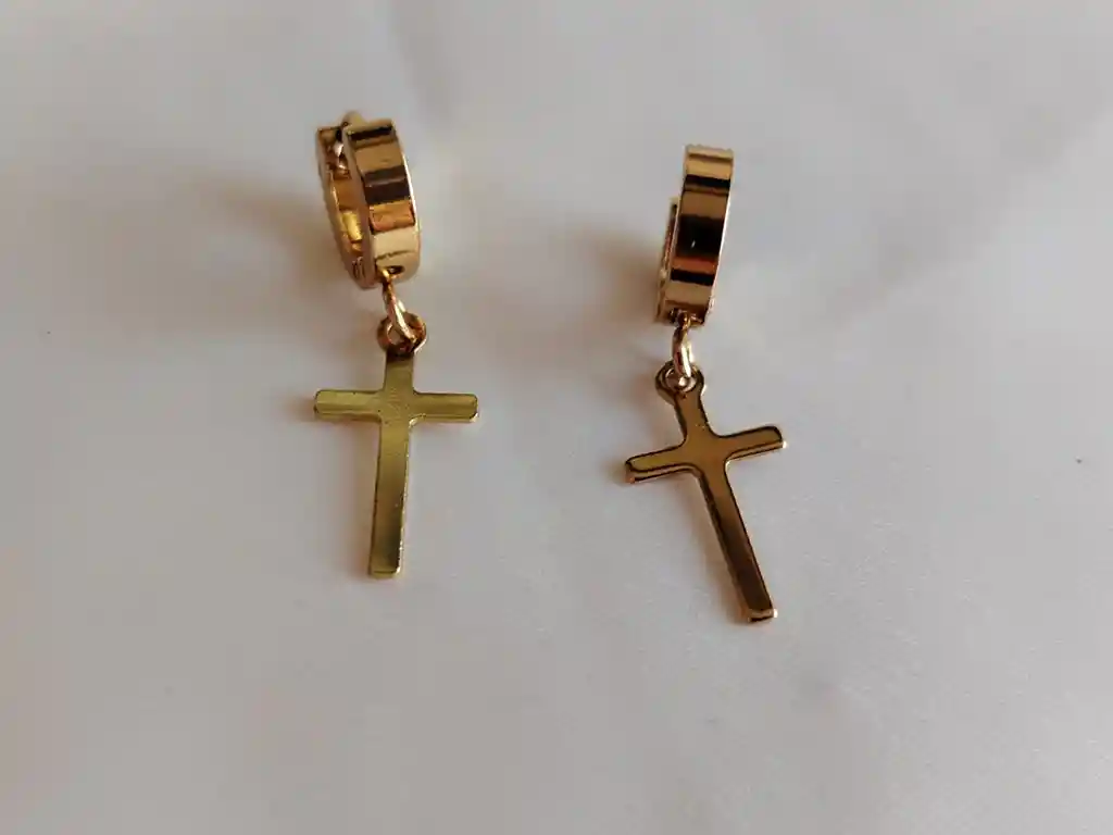 Aretes tipo argolla en acabado dorado con cruz colgante de diseño liso y elegante. Un accesorio clásico y sobrio, ideal para uso diario o para complementar looks formales y casuales.